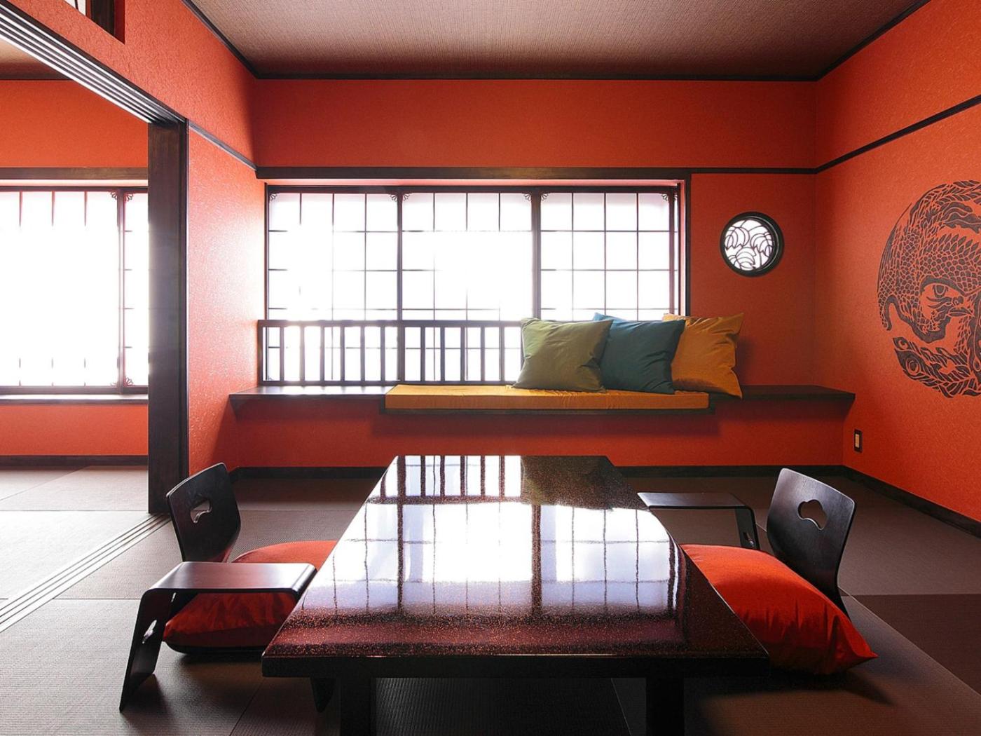 Japanese-Style Room with Shared Bathroom - Non-Smoking. Rooms feature a colourful interior with a tatami (woven-straw) floor and a low table with seating cushions. They are furnished with air conditioning, an LCD TV and traditional futon bedding.rooms have an attached toilet, while bathing facilities are shared. ;
